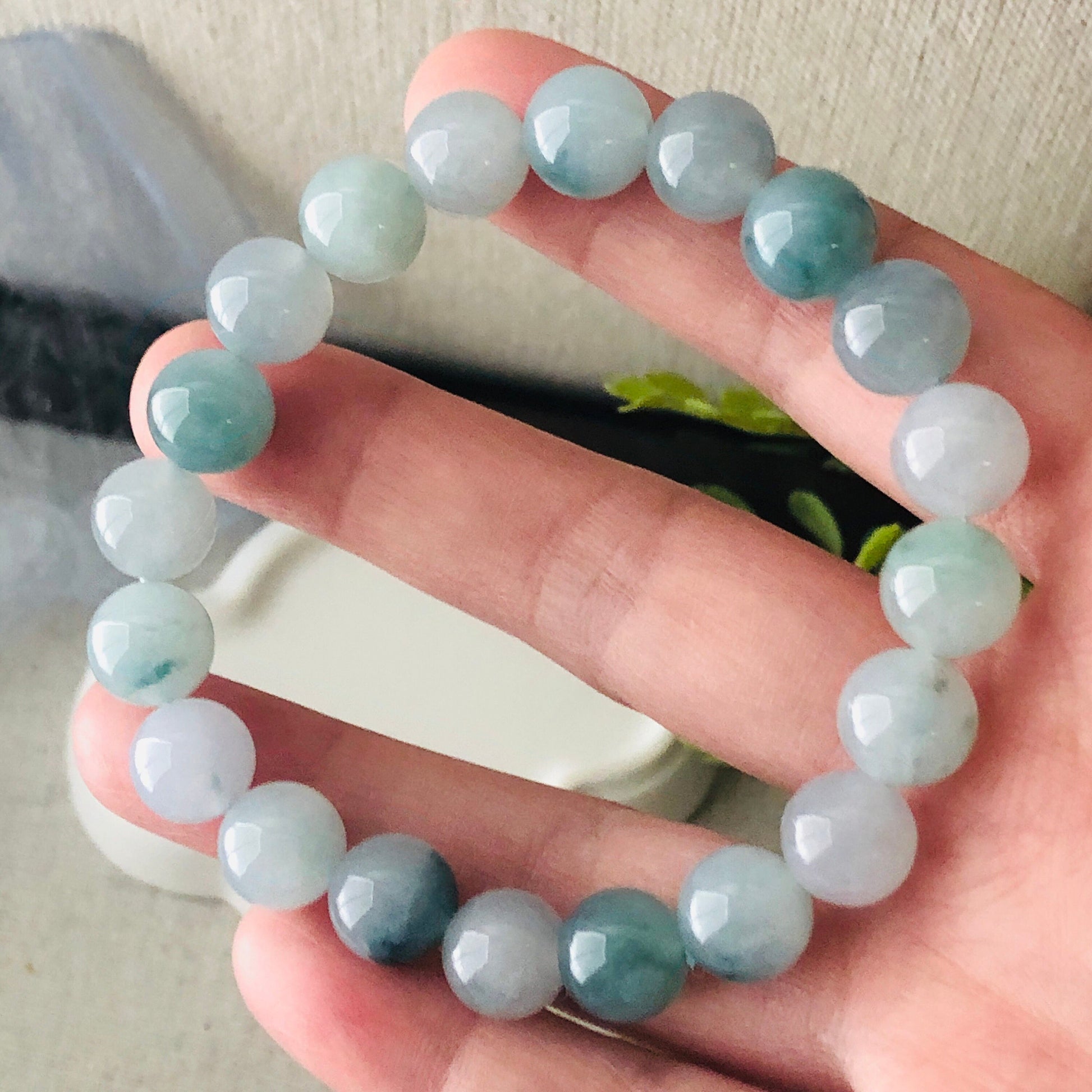 Title: 10 mm Icy Blue Green Float Flowers Jade Jadeite Bead Bracelet