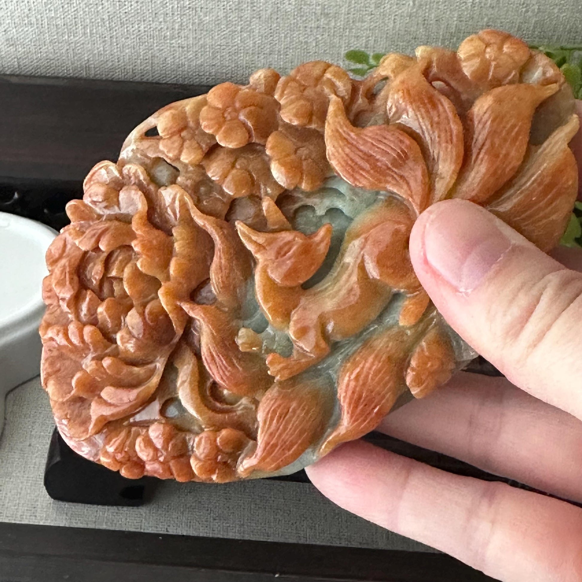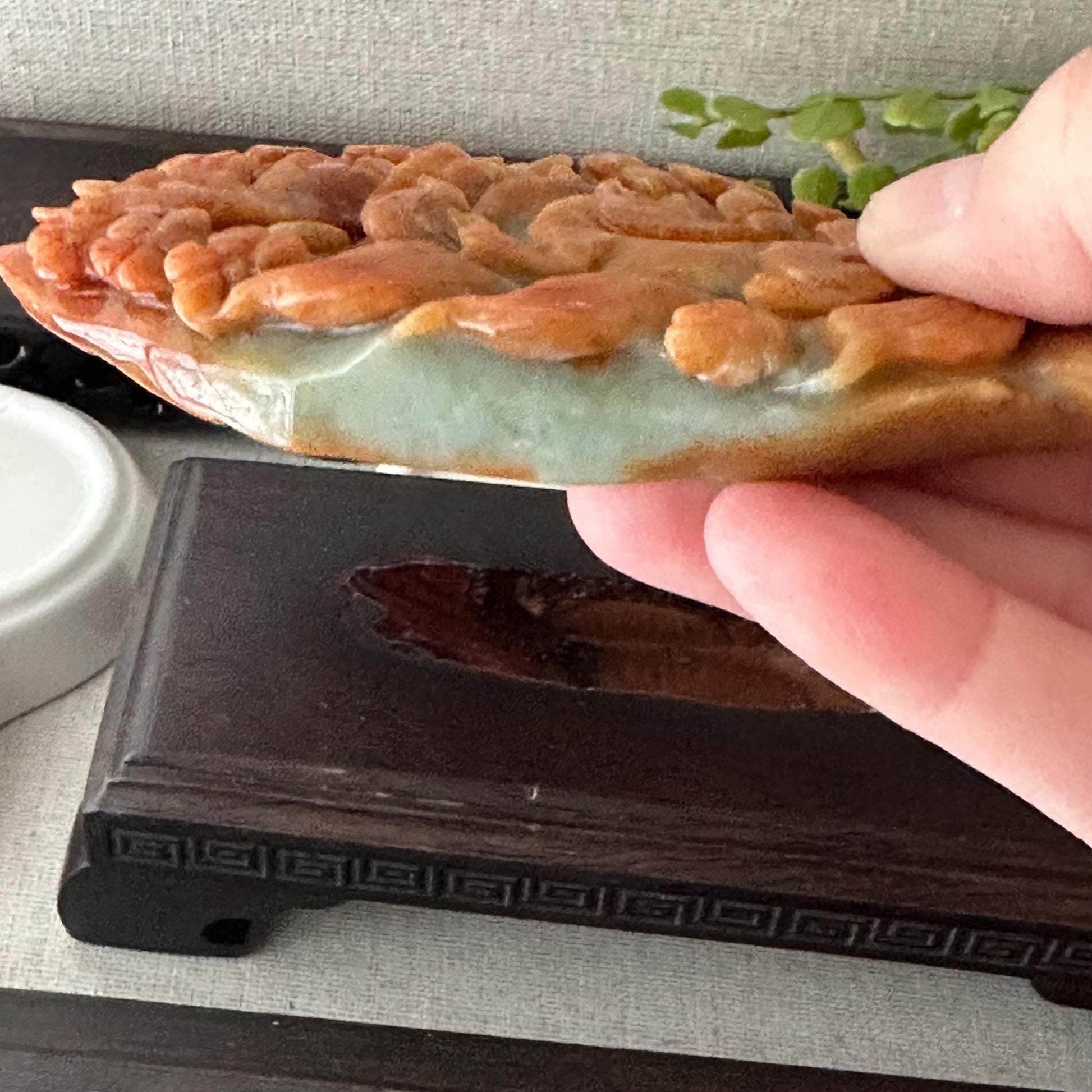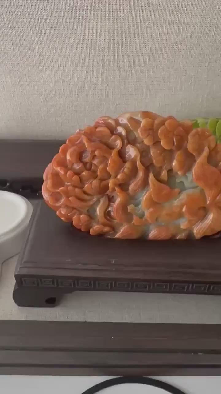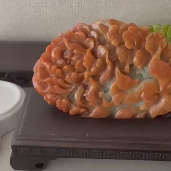 🔴115mm Red Brown Jadeite Jade Carved Flower Kitsune Fox Tail Statue Display