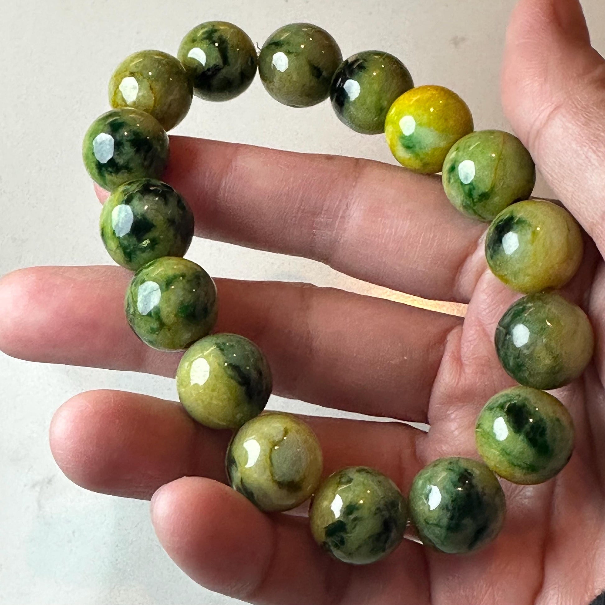 13.6mm Glossy Yellow Green Float Flowers Jadeite Jade Round Bead Bracelet RARE