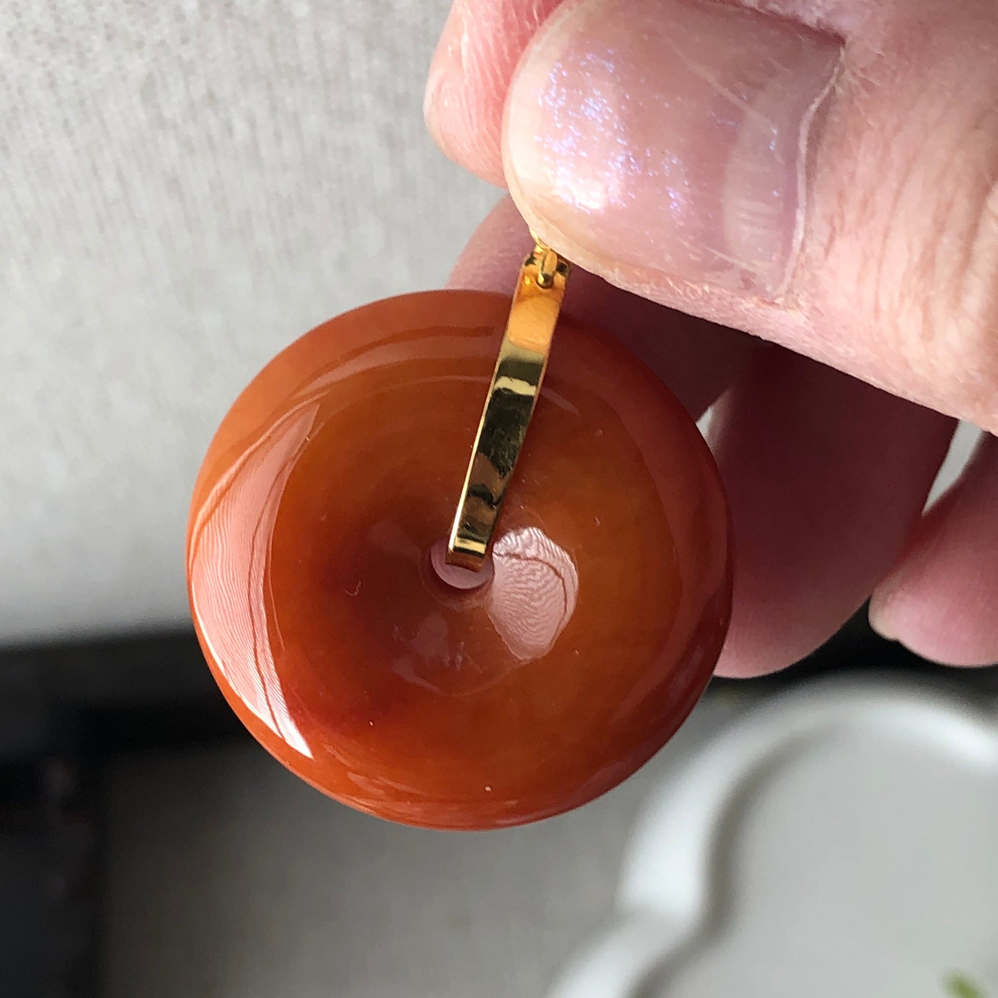18K 27mm Jadeite Jade Red Brown Donut Pendant RARE