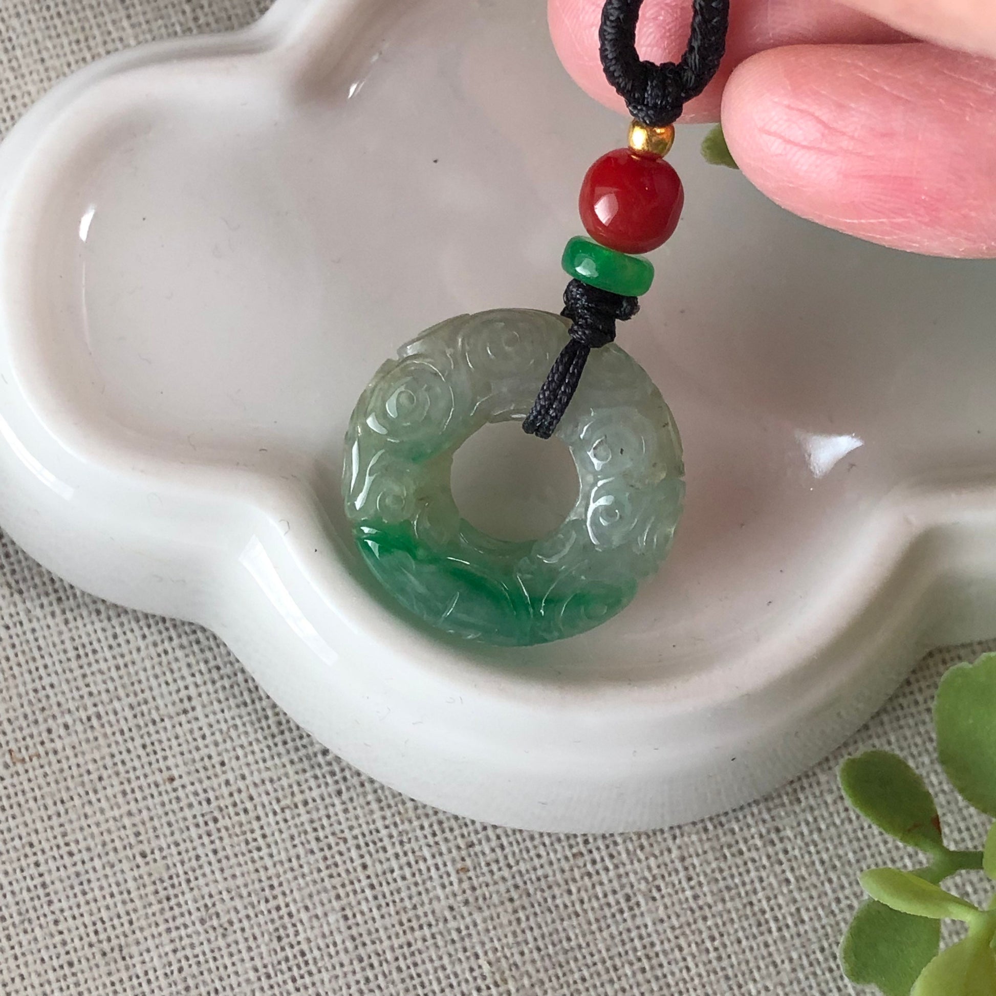 Title of Item: 22.2mm Jadeite Jade Icy moss Green Carved Peace Donut Pendant