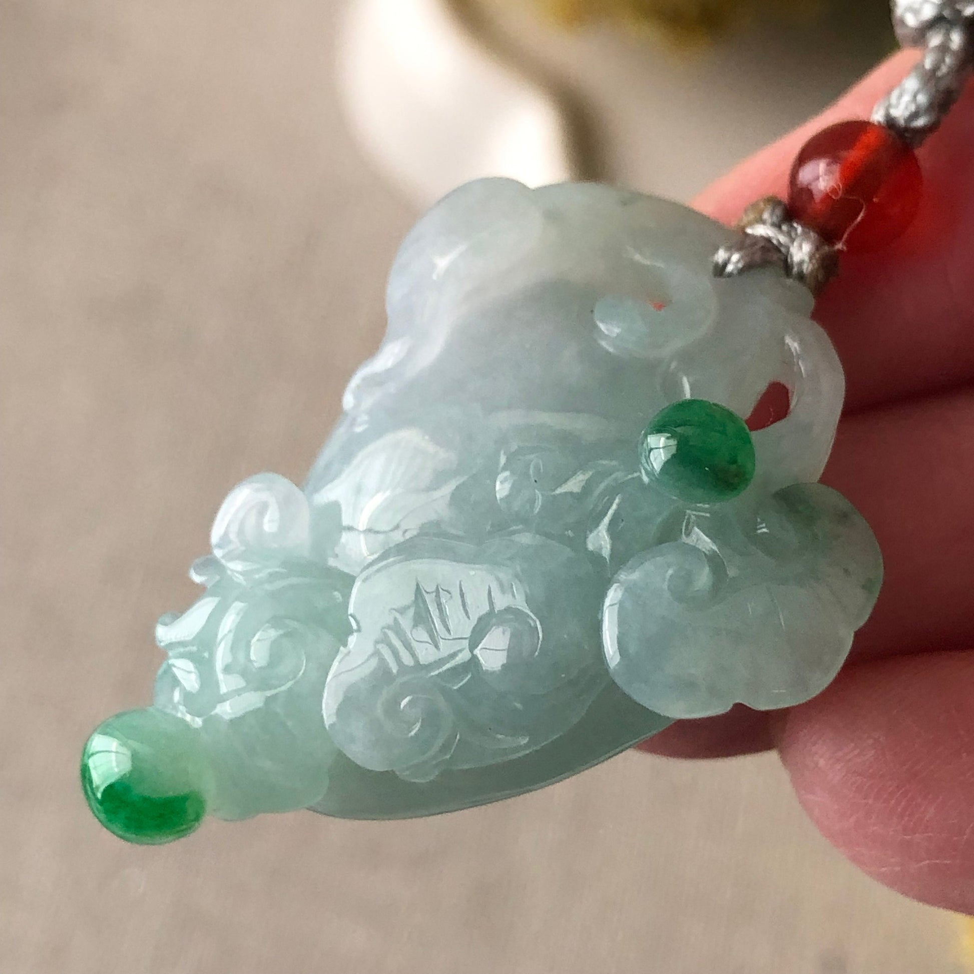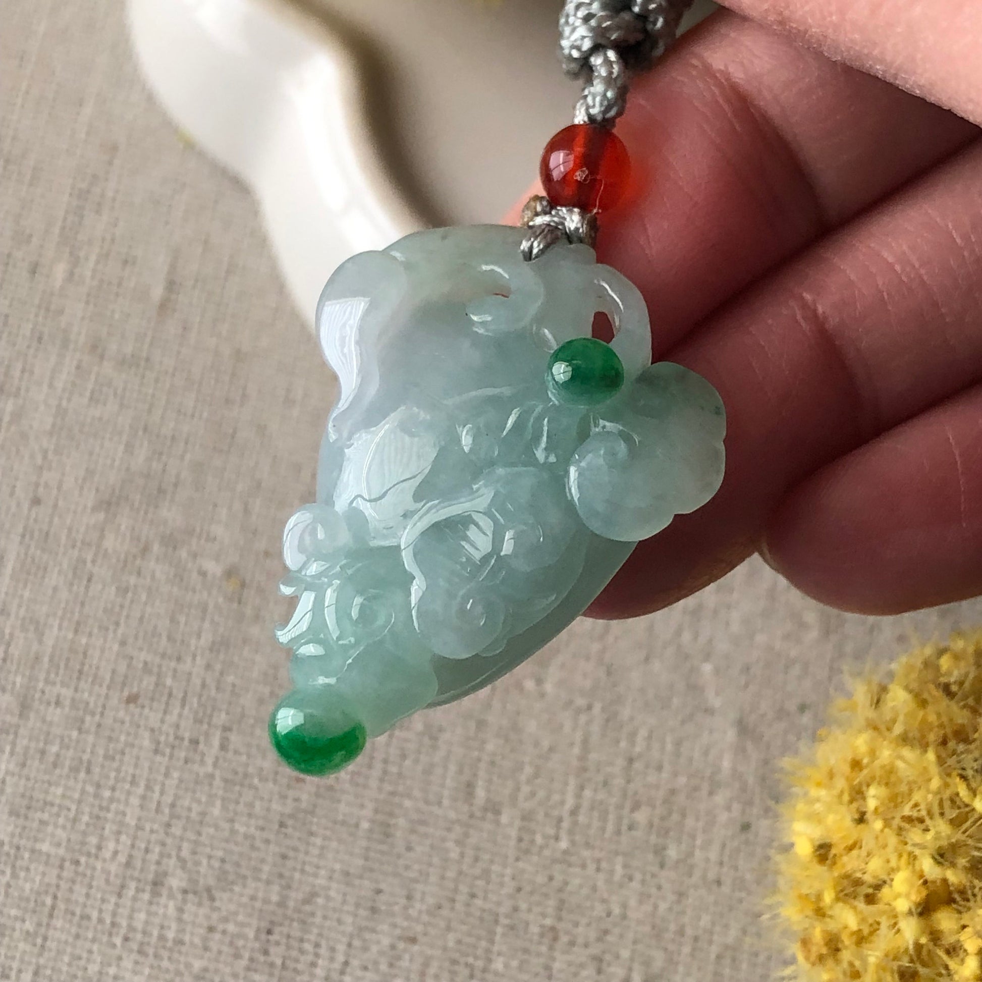 32mm Icy Greenish Jadeite Jade Carved Peach Ruyi Clouds Pendant Neck Rope Tie