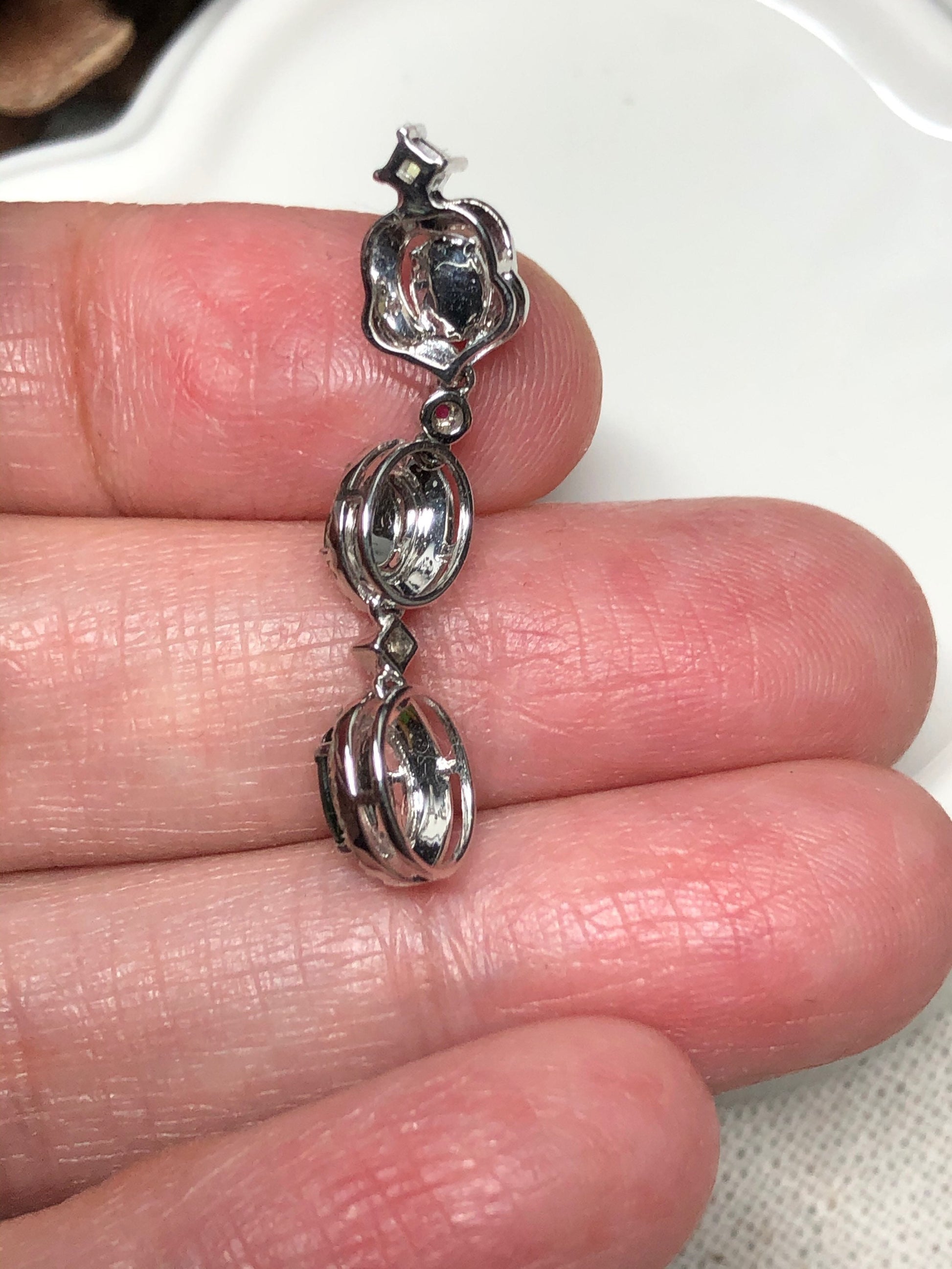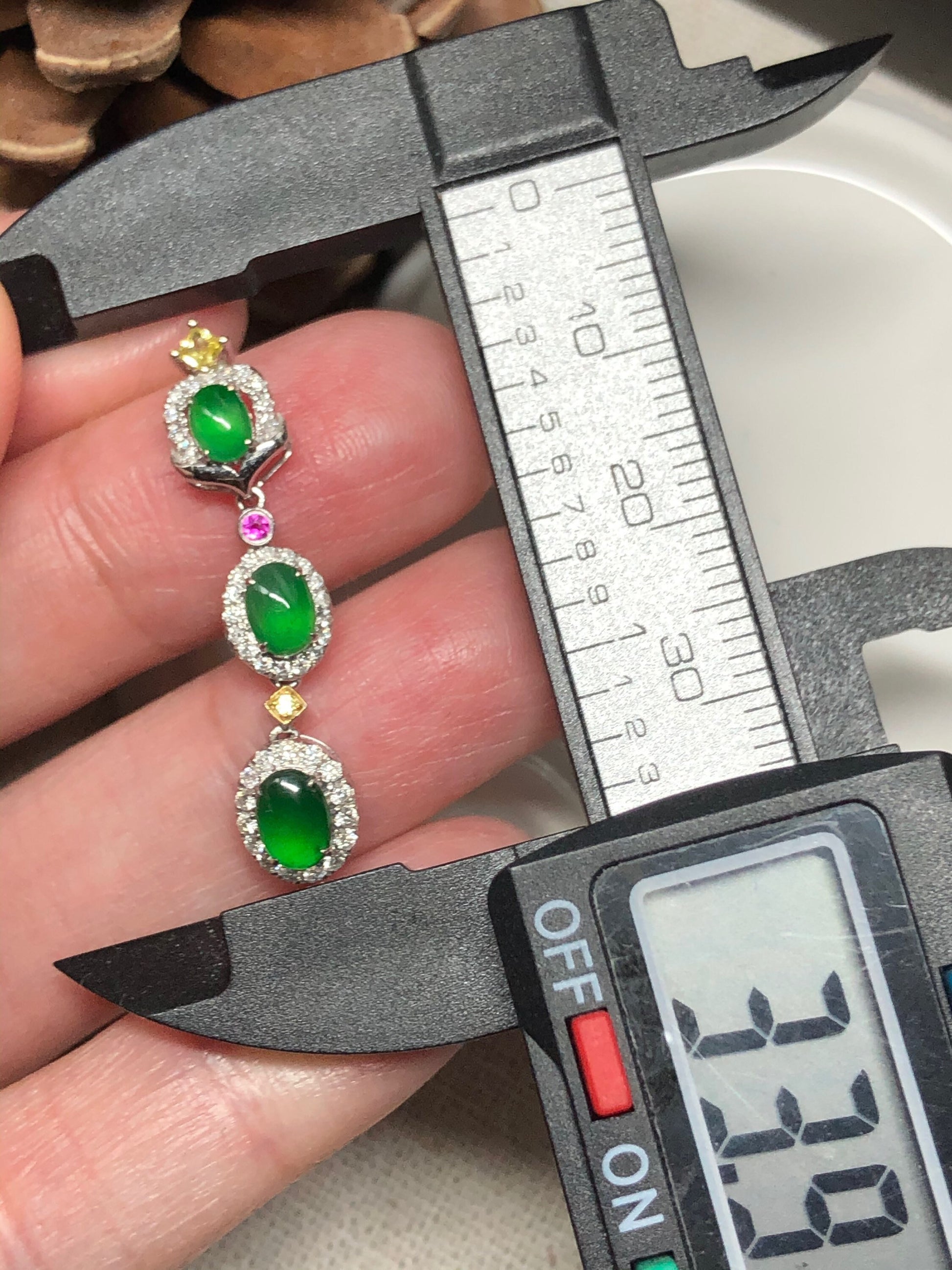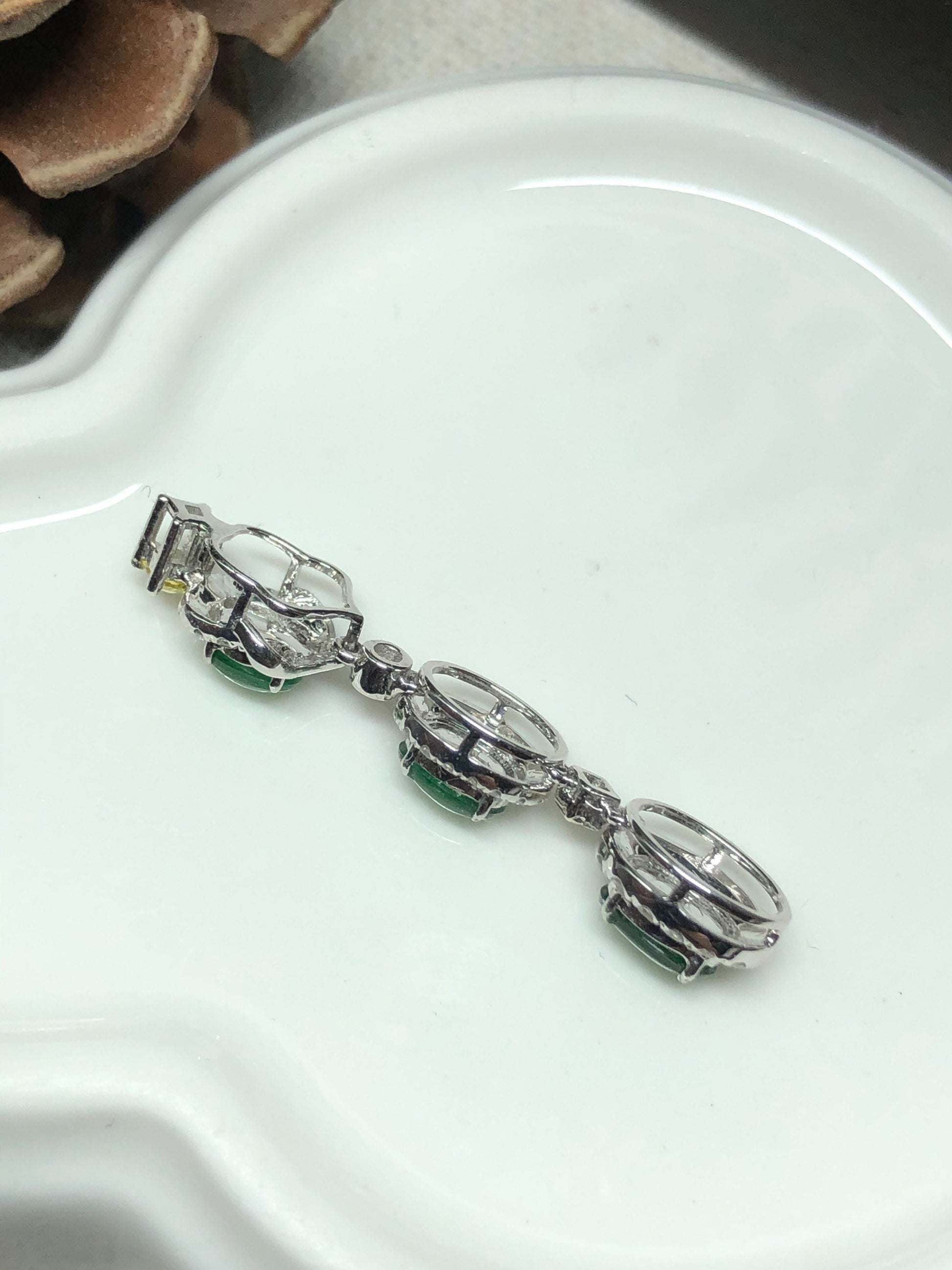 Comments: Jadeite customized in 18K white gold setting. Pendant is dainty. Cabochons are vibrant.