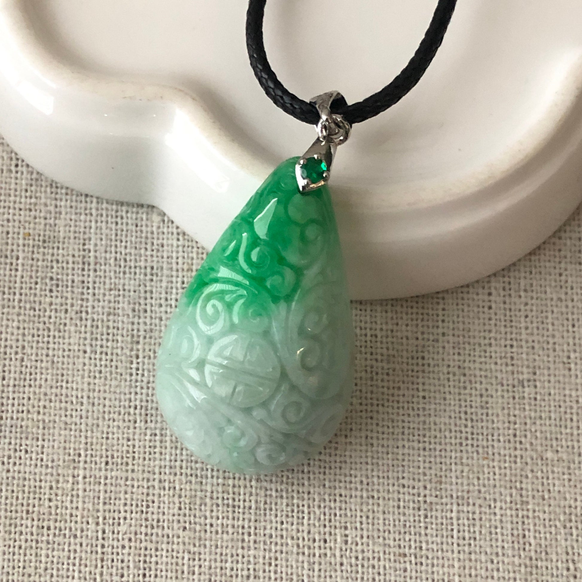 35mm Green Carved Asian Pattern Jade Jadeite Pendant Drop Shape