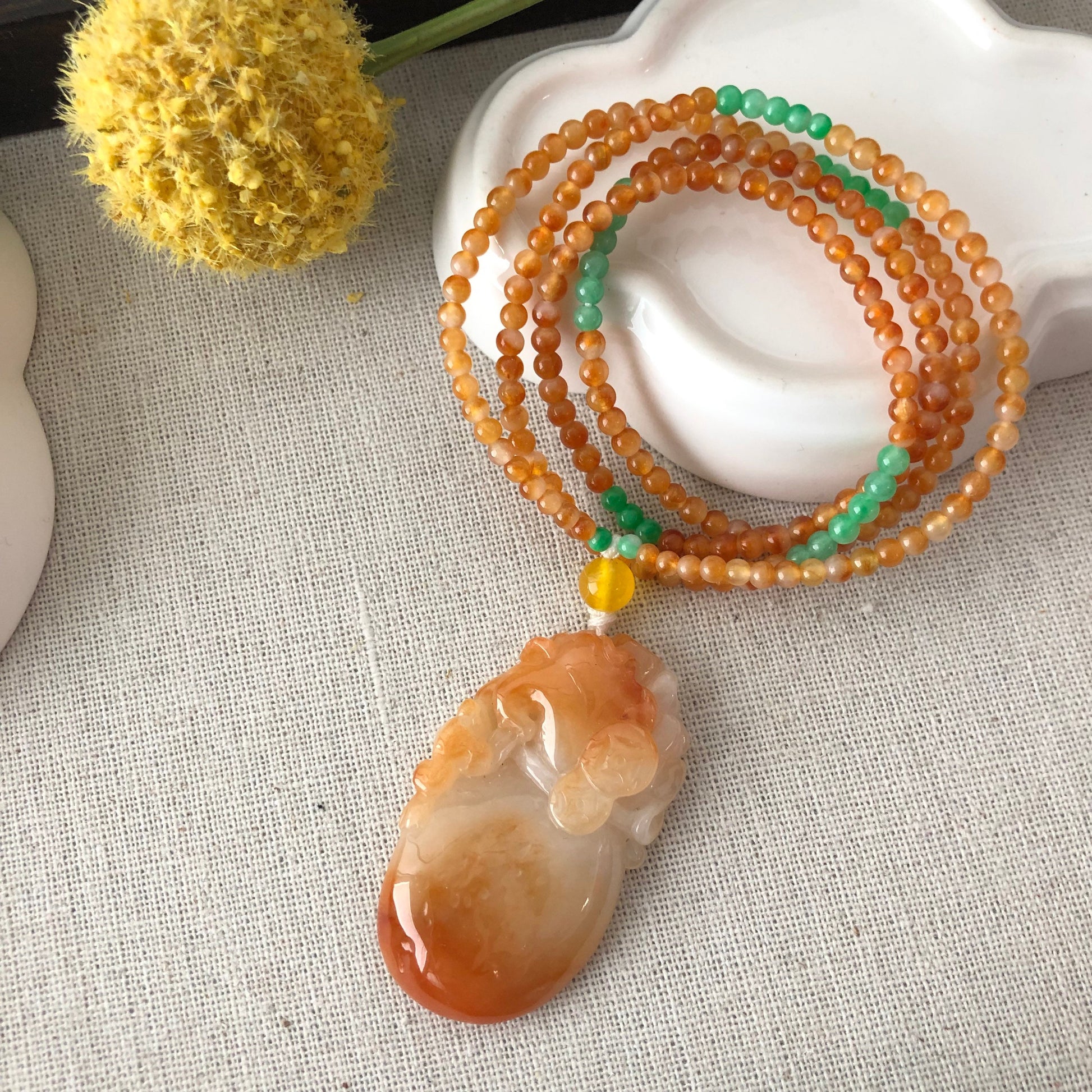 Comments: All natural texture. Flawless item. May have some cotton or natural impurities. Beautiful 3D carved petal embedding a worshipper. Very unique carving. Item and certificate is ready to be shipped!!. Rare item. Comes with upscale icy red brown bead necklace.