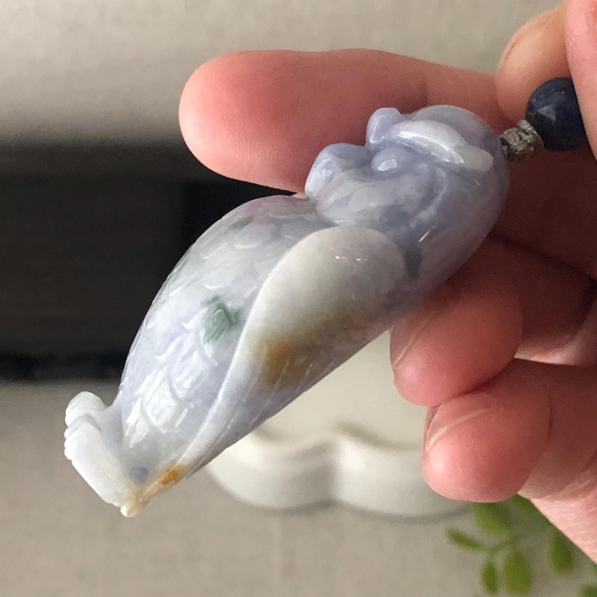 48.5mm Jadeite Jade Lavender Green Float Flowers Carved Owl Pendant