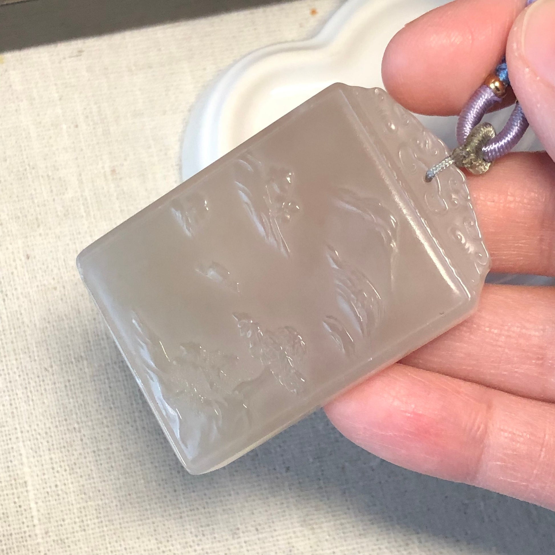 Comments: beautiful carving. Hard to find Smokey pink Hetian jade. Collection item.