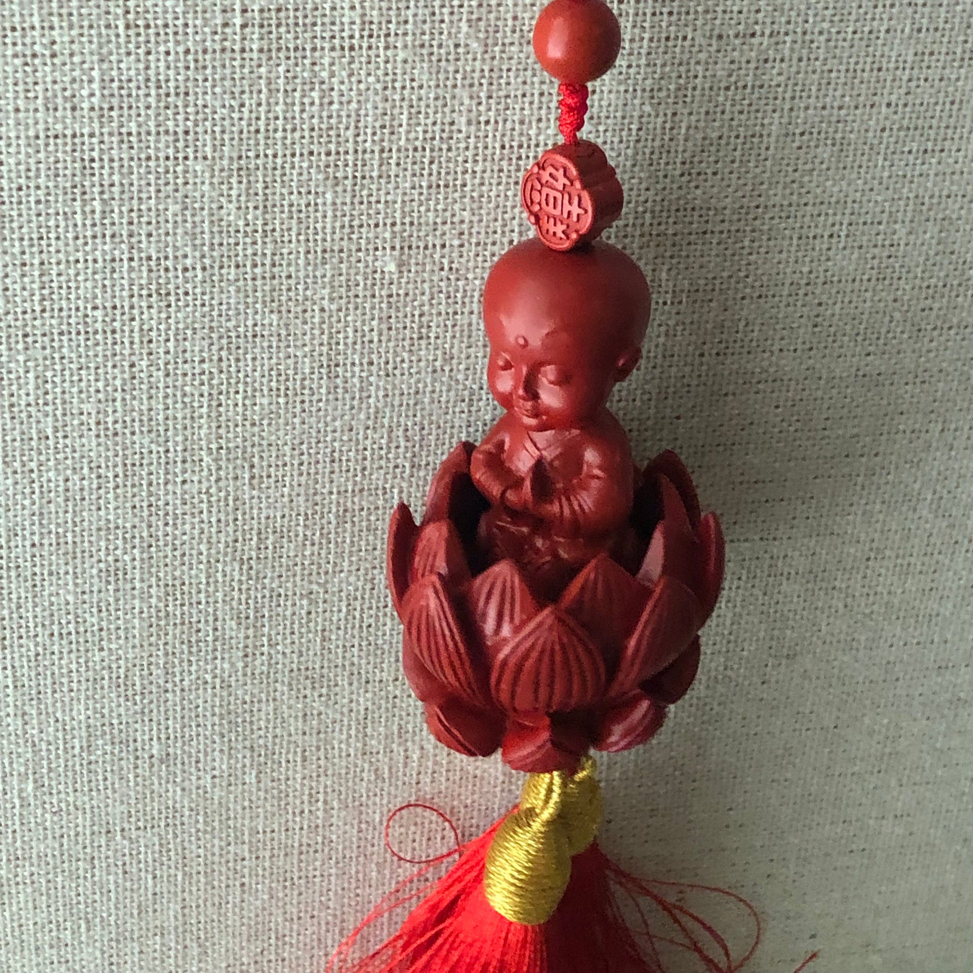 51mm Cinnabar Carved Baby Praying Buddha Lotus Flower Key Charm Pendant