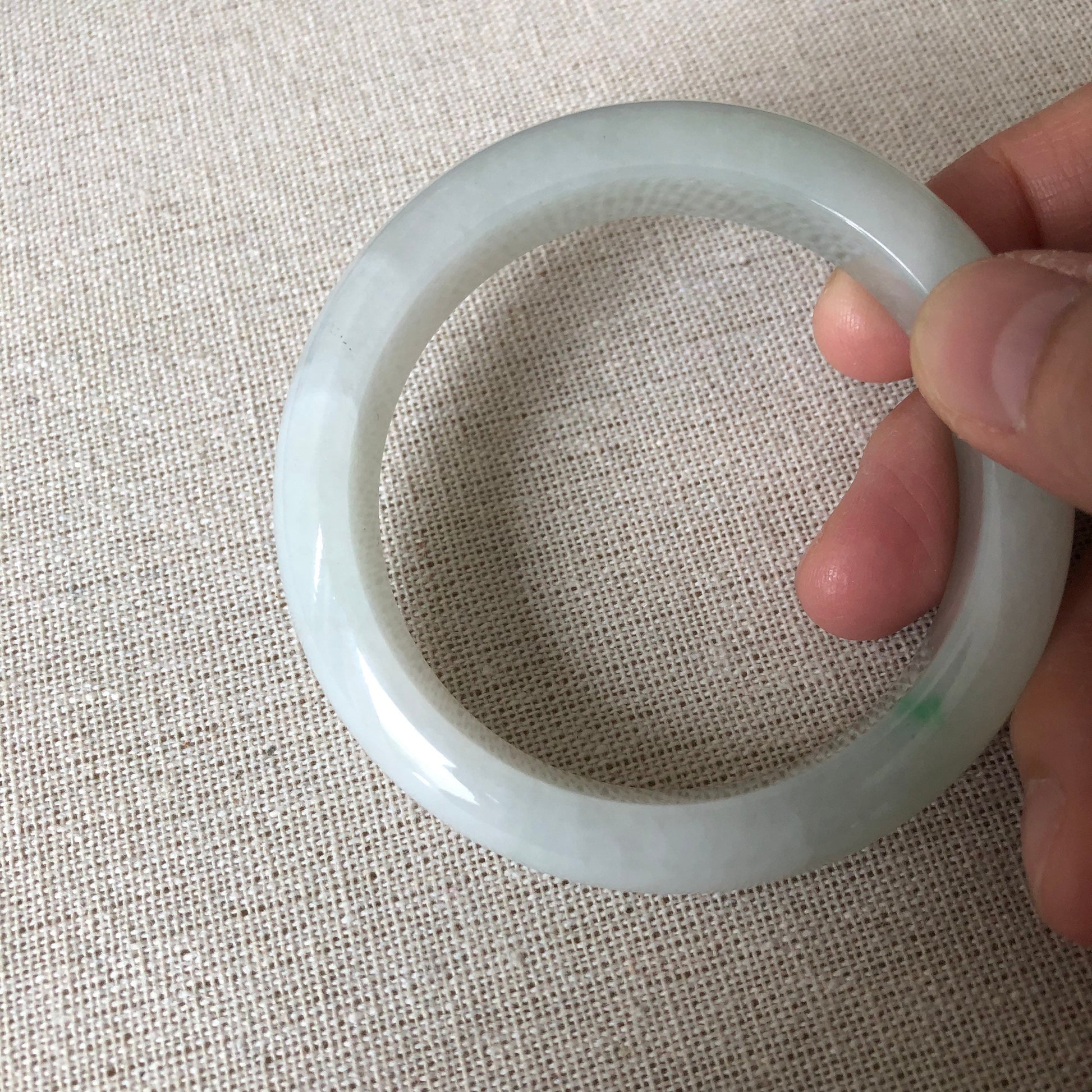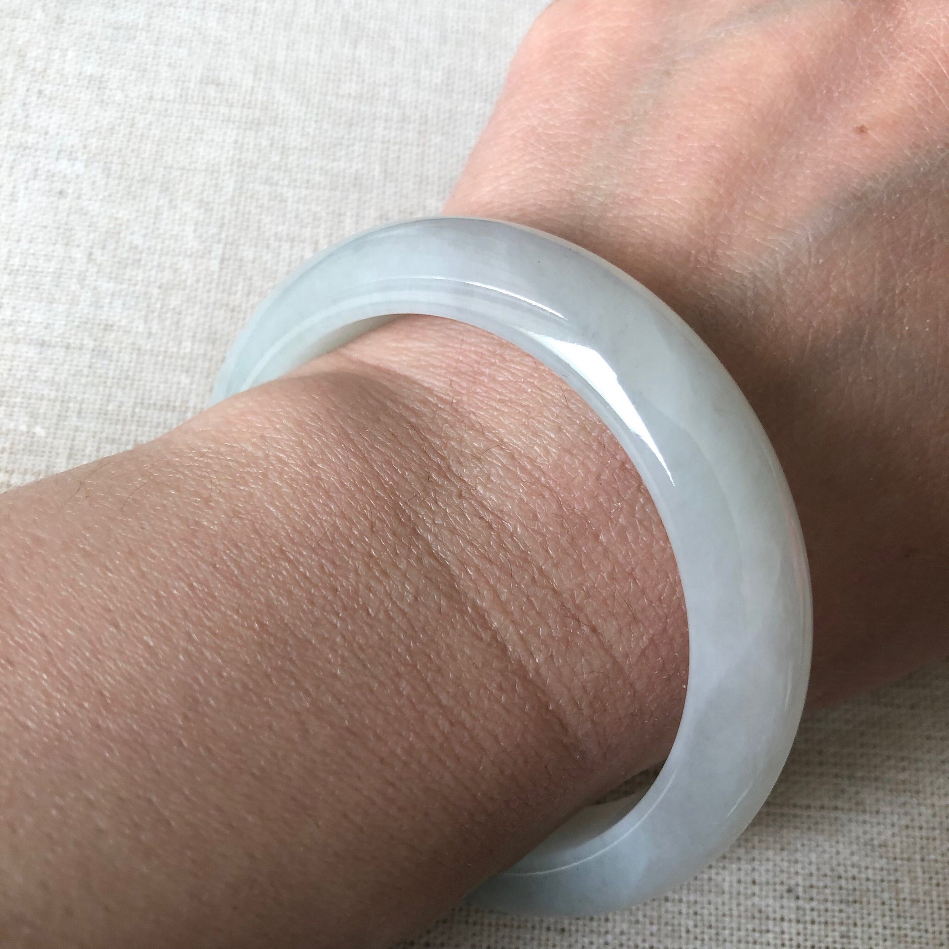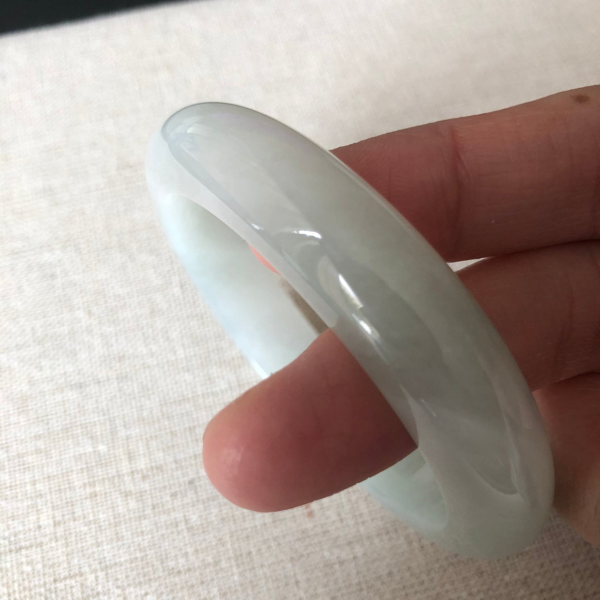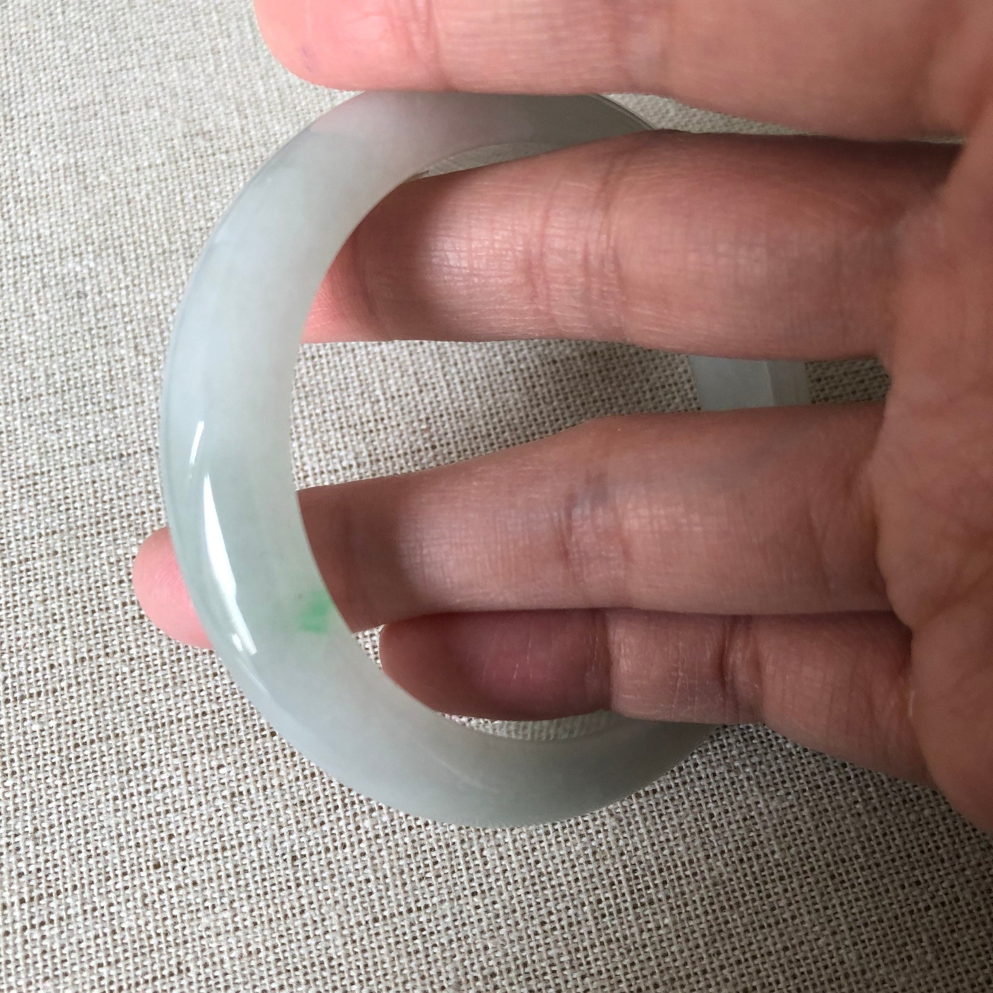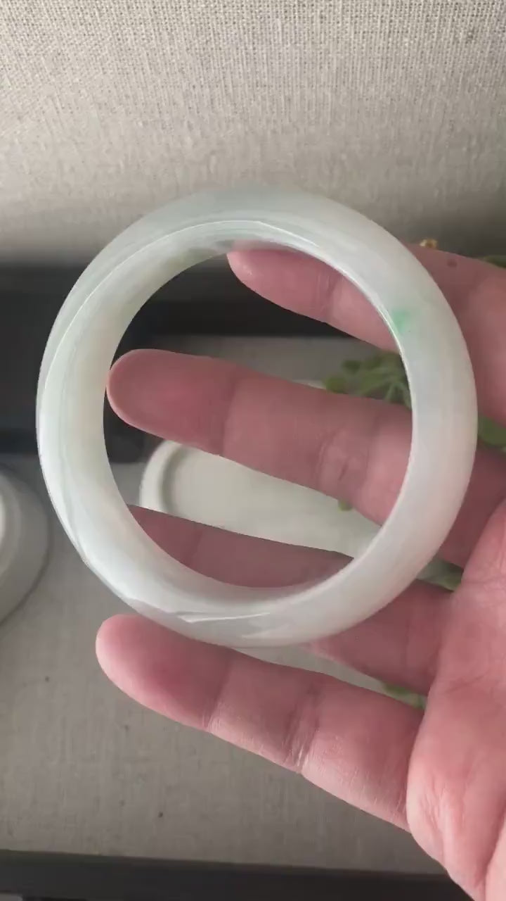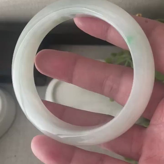 ✅ Comments: Photos cannot depict this beautiful 😍 bangle. It is very moist and icy and has a little streak of green. Great size can fit from 54-55mm. All natural texture.