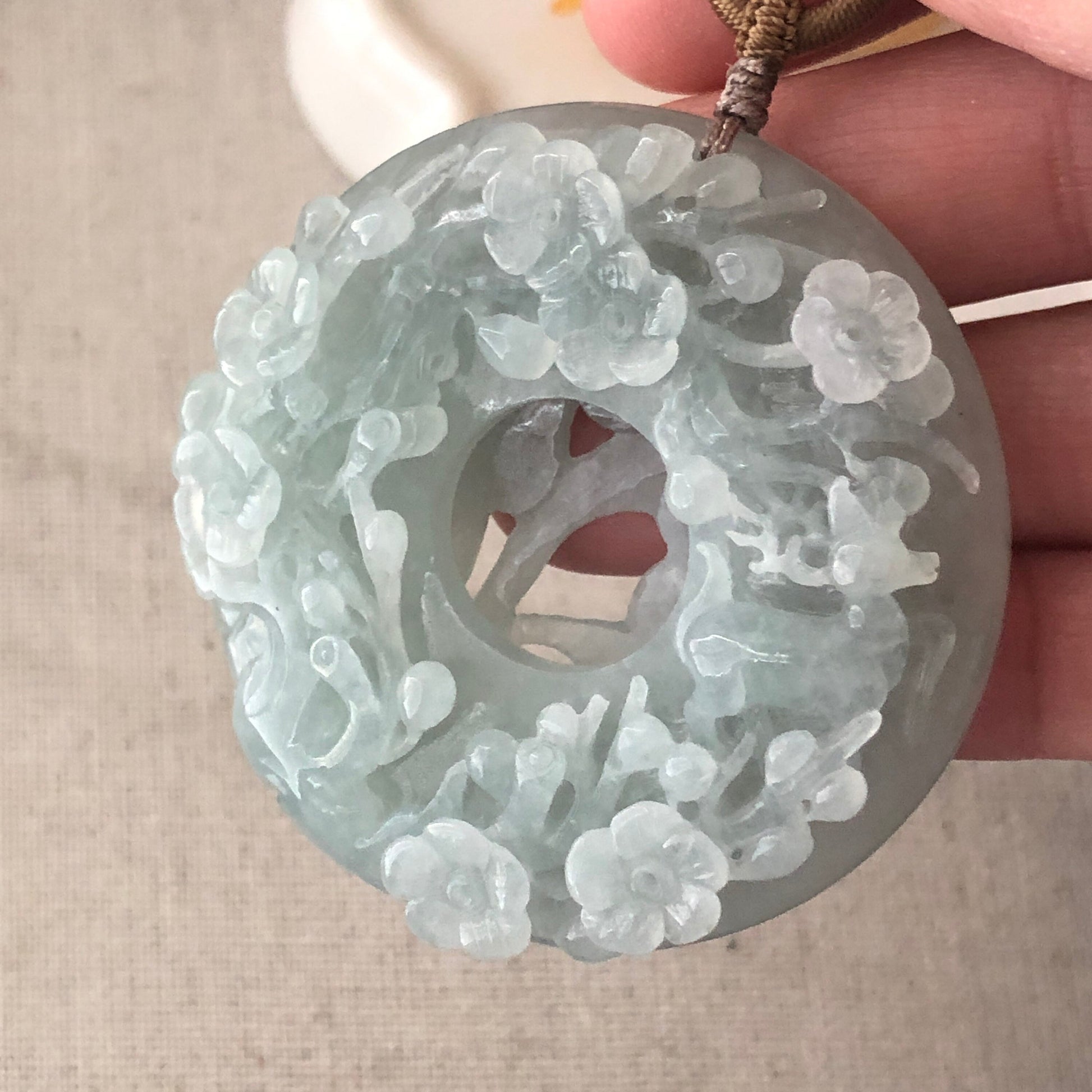 55.3 mm Jadeite Jade Icy Tint Green 3D Carved Flower Ruyi Pendant
