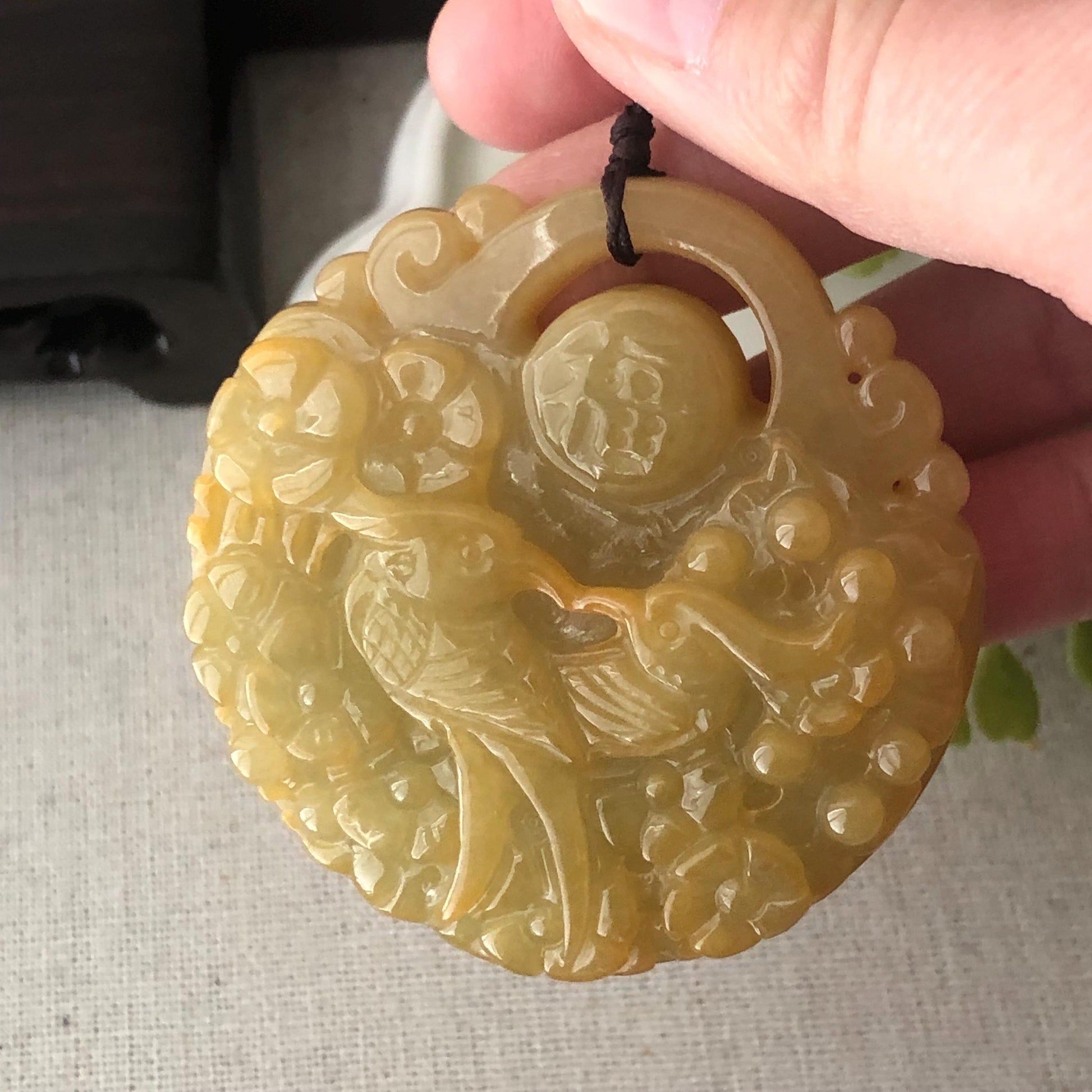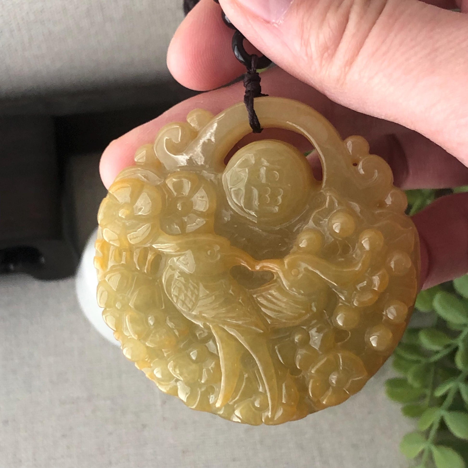 55 mm Icy Yellow Brown Jadeite Jade Carved Flower Phoenix Pendant