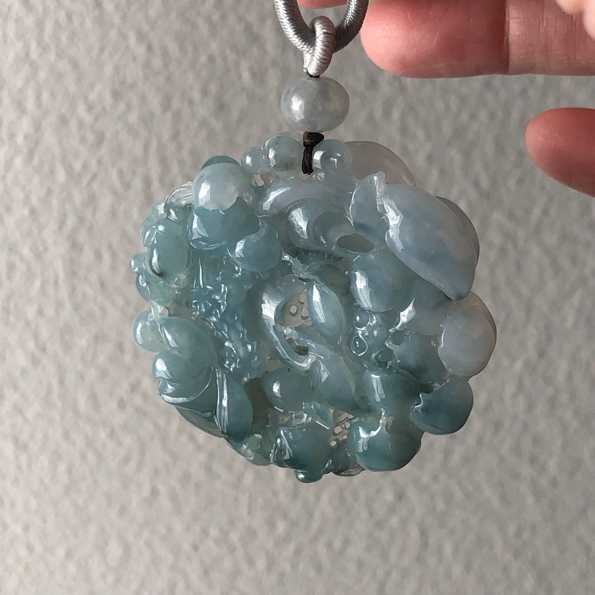 Comments: Jadeite comes with neck rope tie. Beautiful carved flower that goes well with all types of attire. Beautiful handmade carved. nice blue tone. rare.