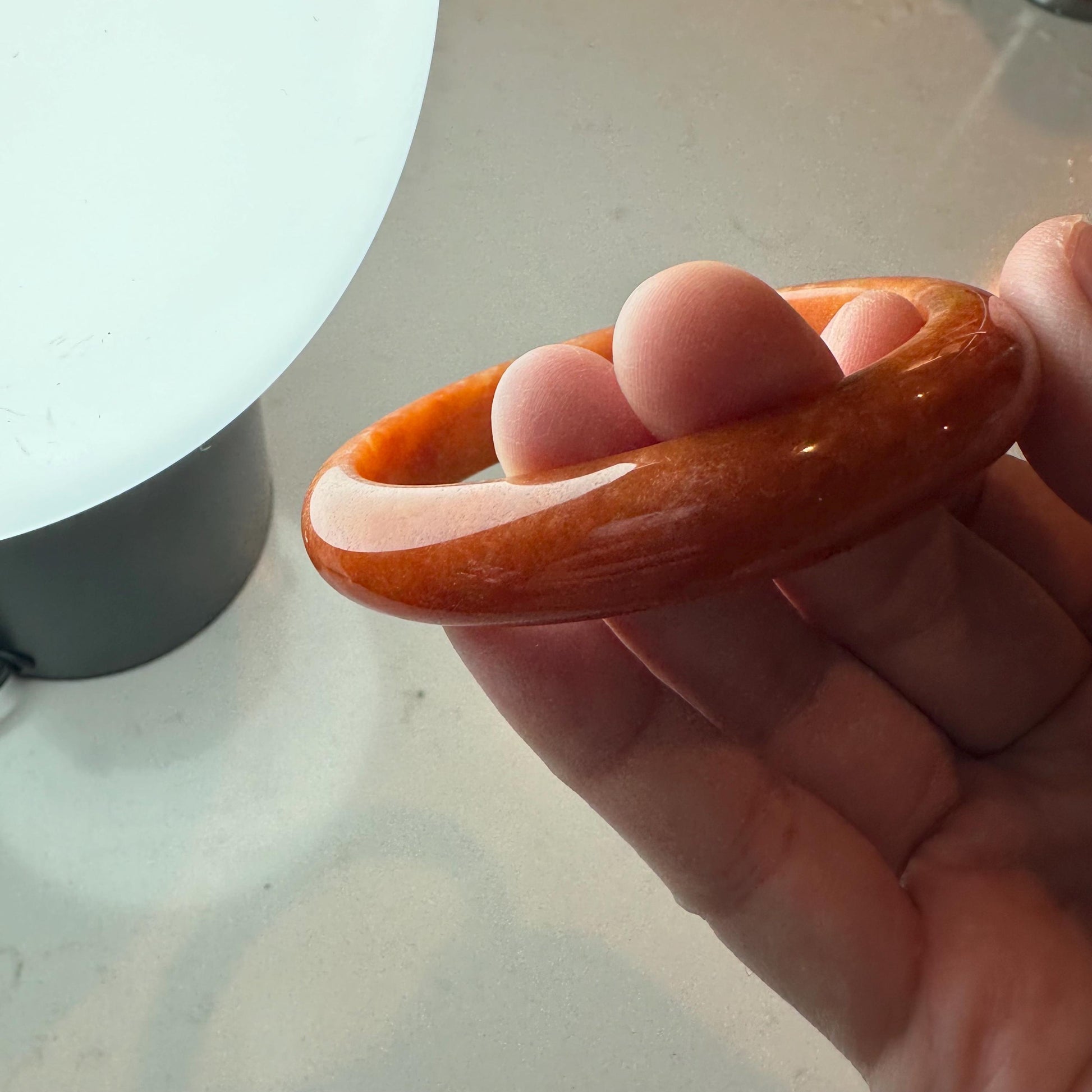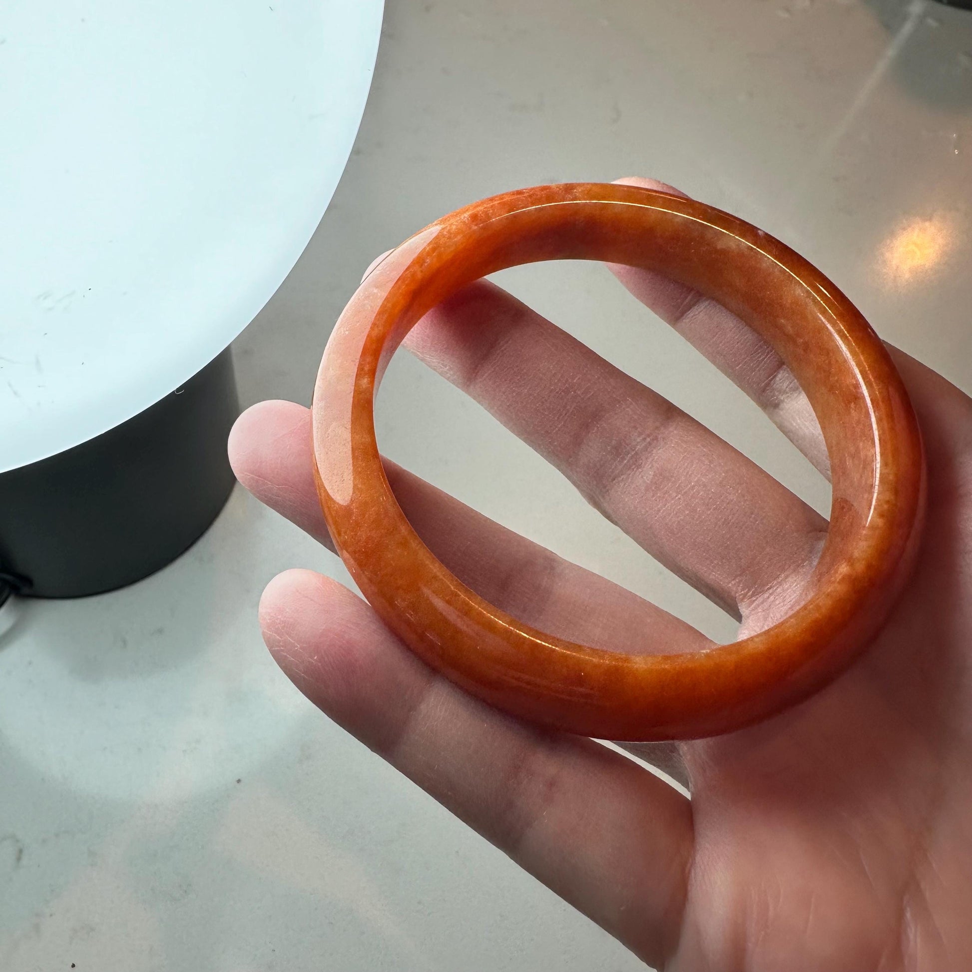 Comments: Item looks better than photos. Solid color that has natural cotton. Rare color. Grade A. In real life, color looks a bit lighter but beautiful. not brown tones. very reddish Orange. recommend. must accept natural beauty of the cotton in the jade.