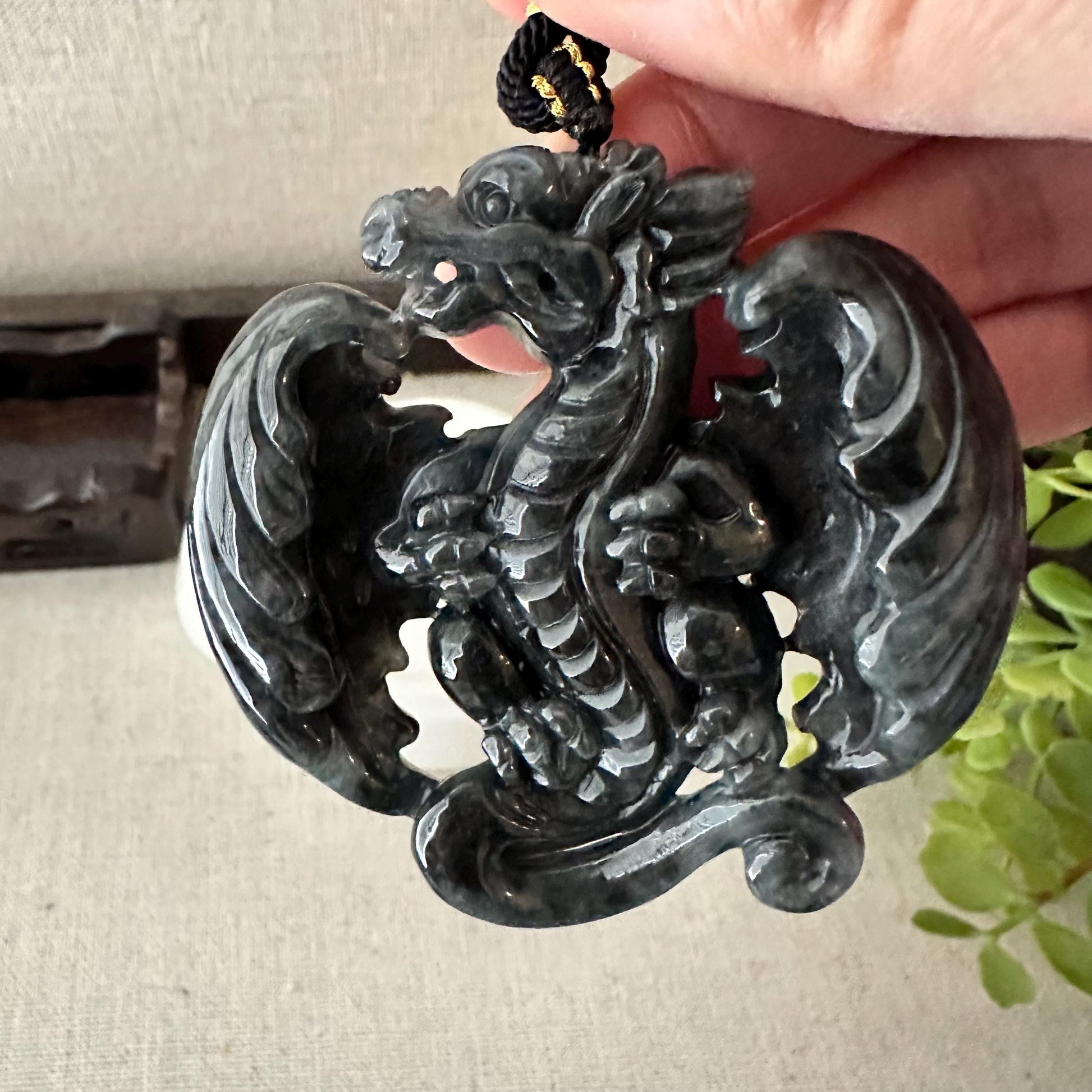 60mm Jadeite Jade Wuji Grey Carved Dragon with Wings Pendant