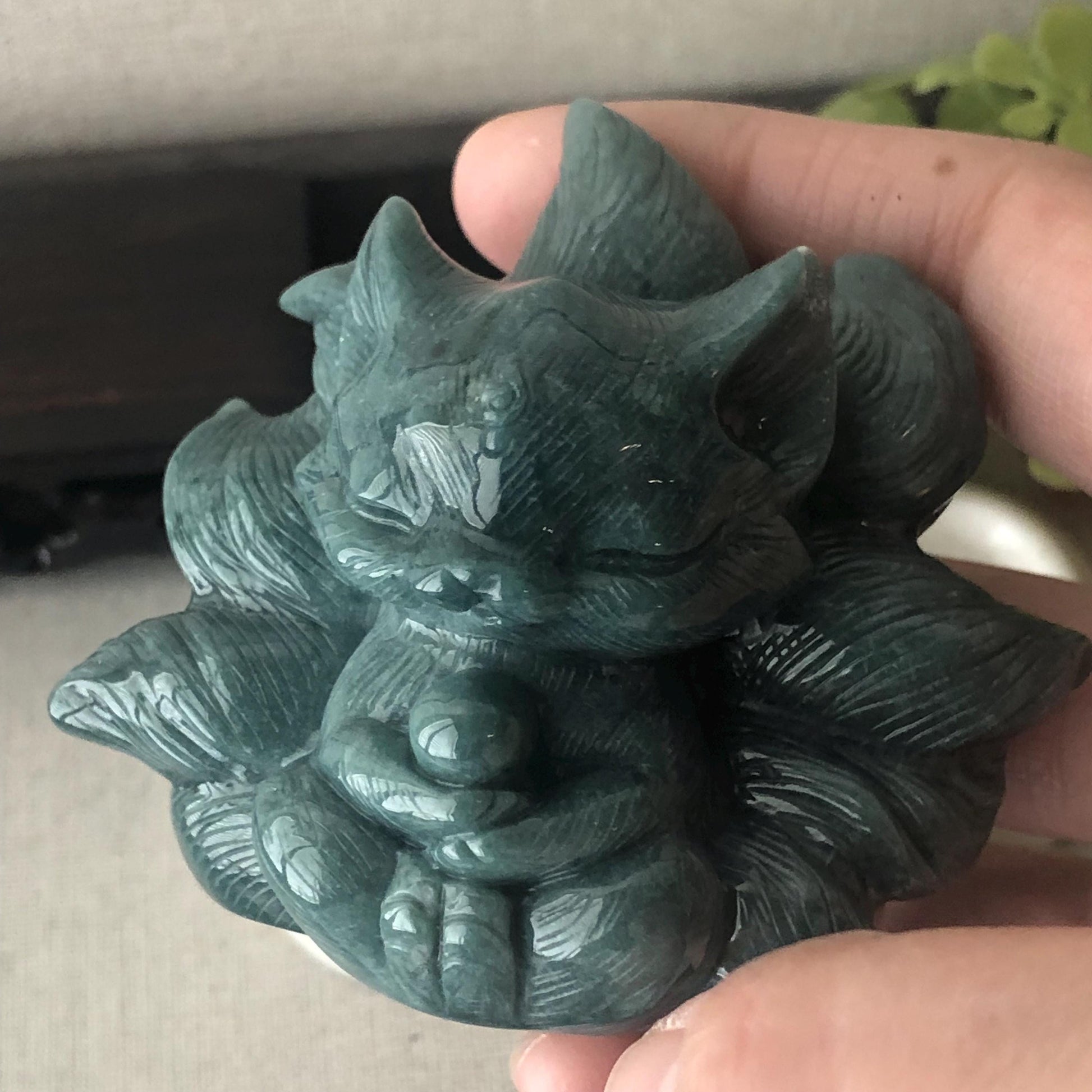 67mm Blue Green Jadeite Jade Carved Foxtail Kitsune Display Statue