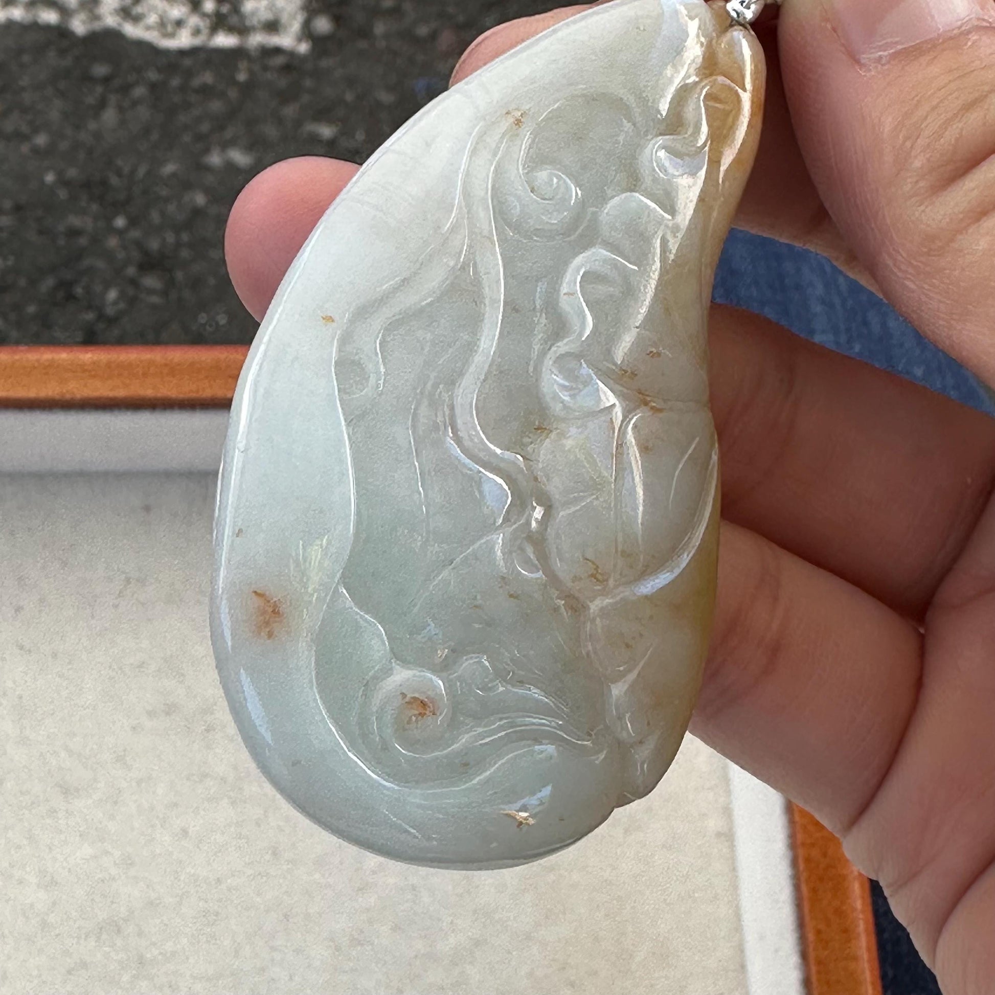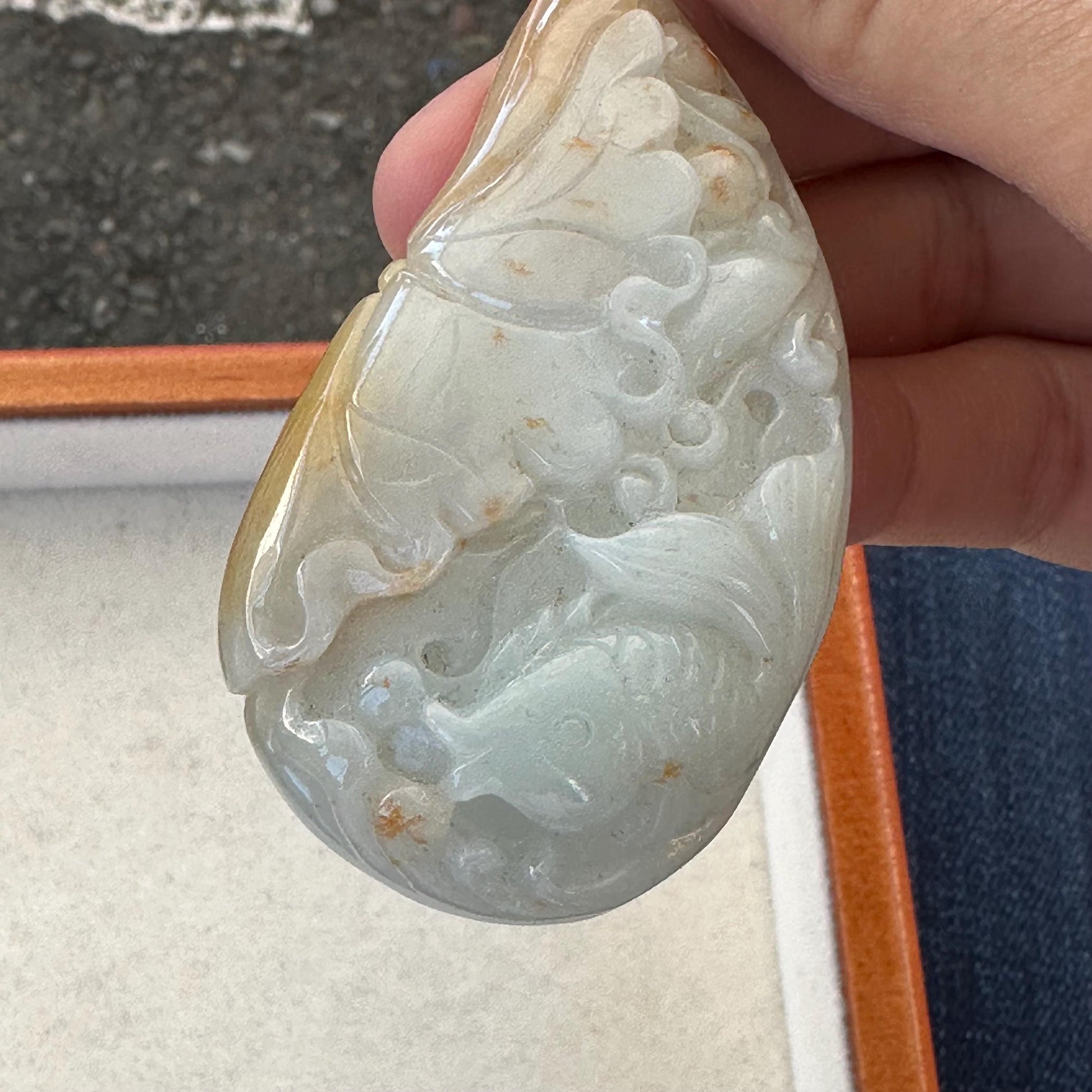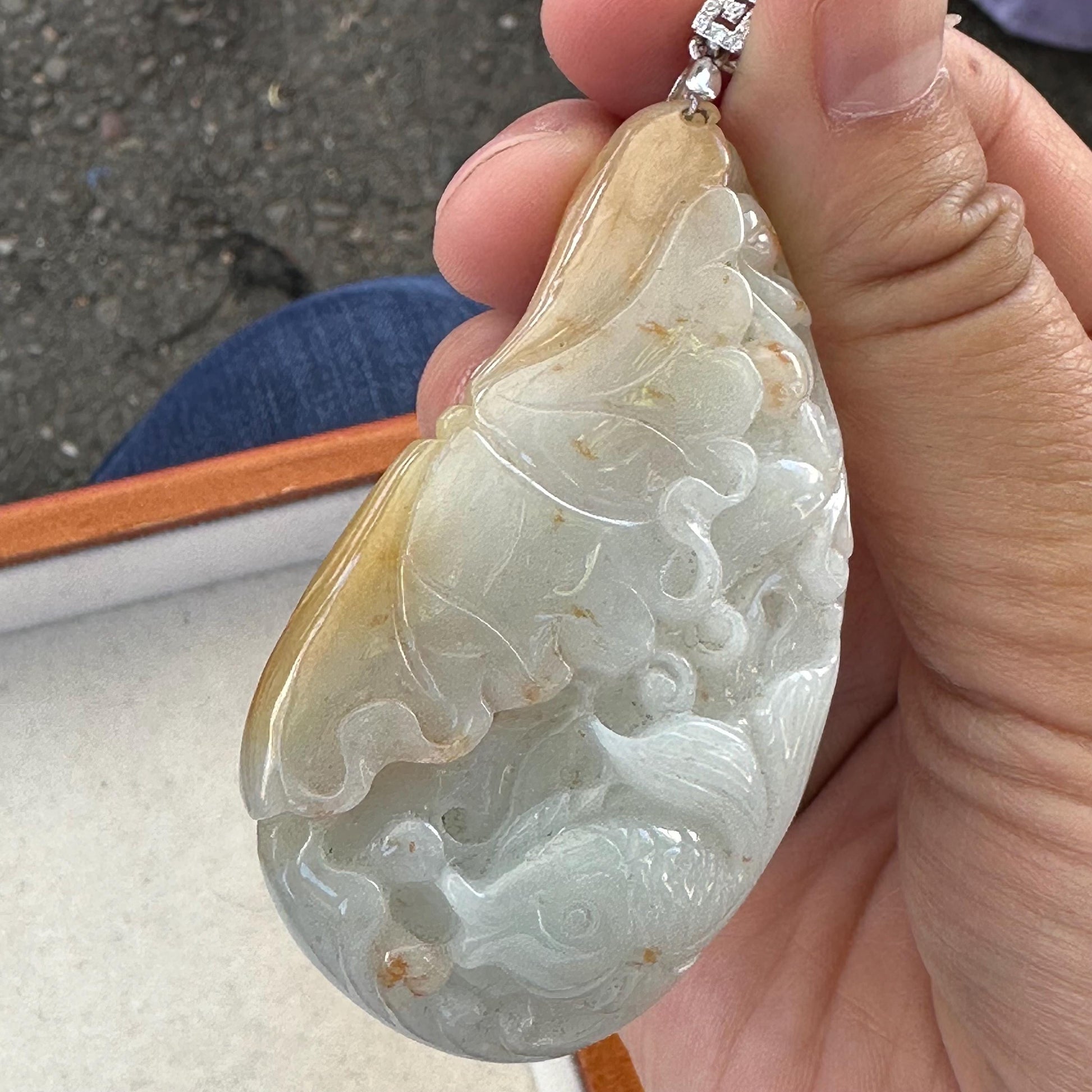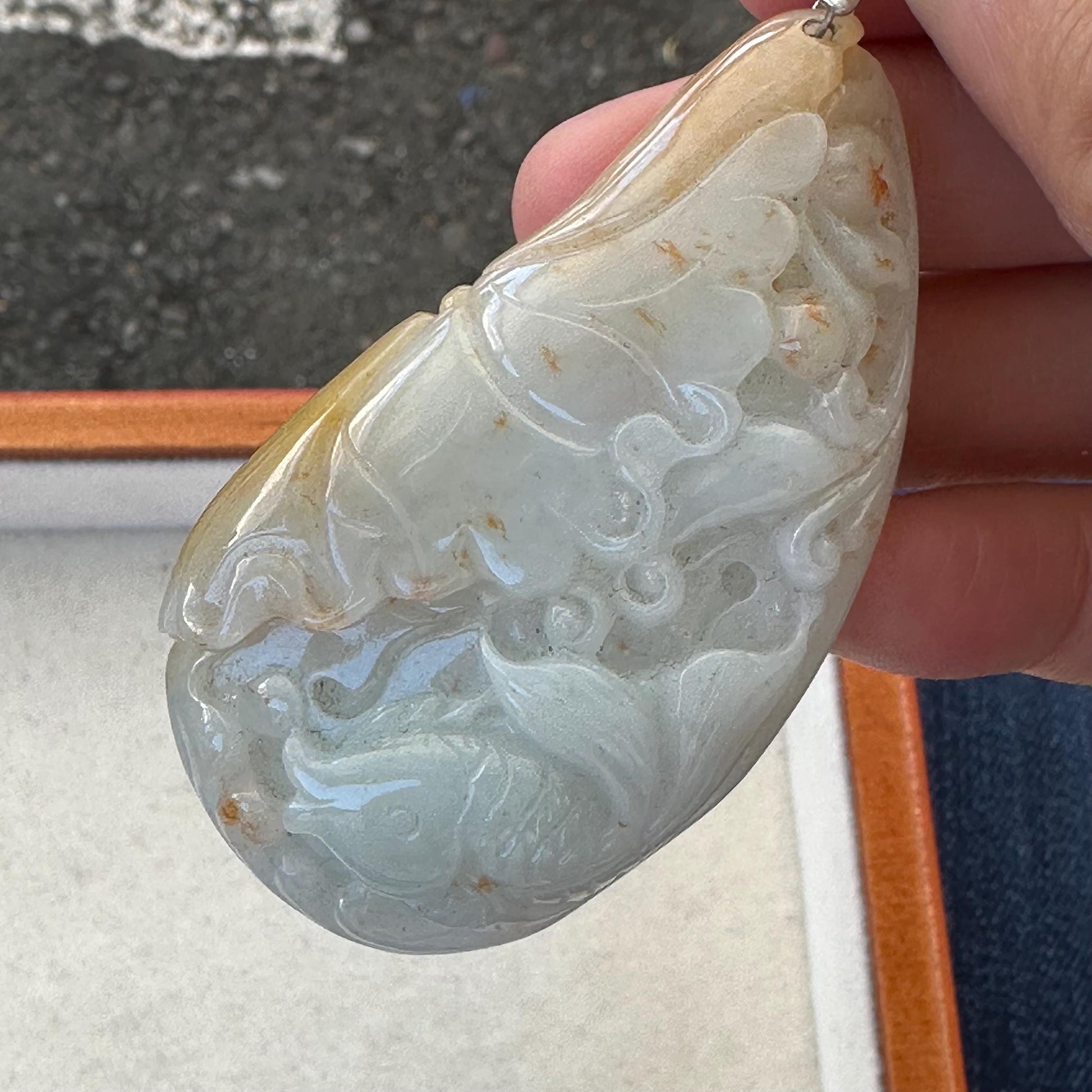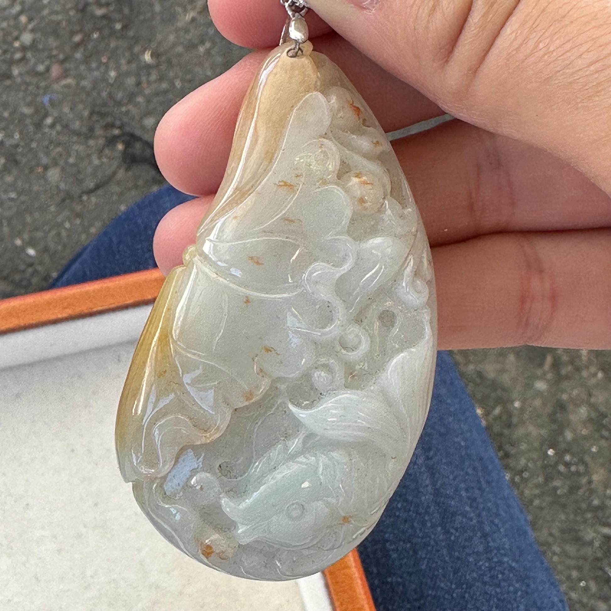 ✅ 68mm Jadeite Jade Red Yellow Carved Fish Flower Pendant