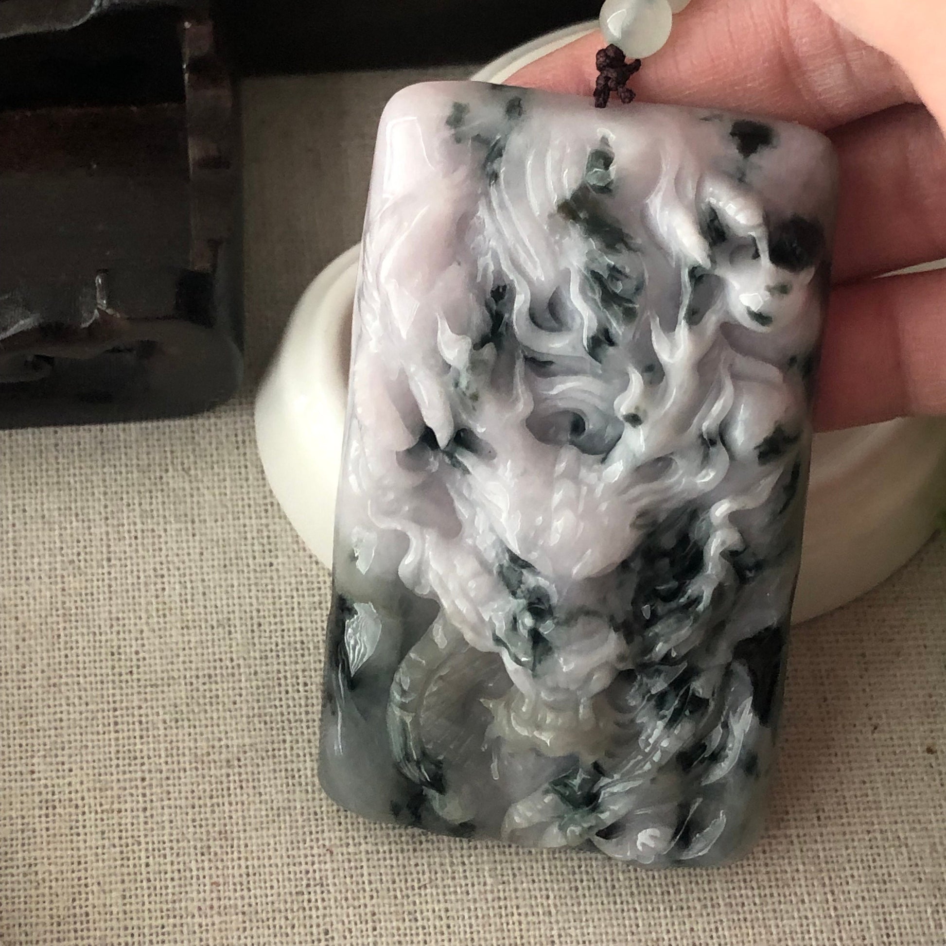 75mm Light Lavender Green Float Flowers Jadeite Jade Carved Dragon Pendant
