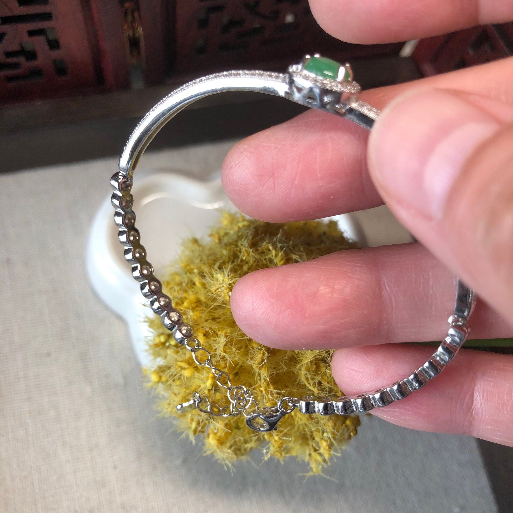 925 Sterling Silver Grade A Green Cabochon Jadeite Jade Bracelet