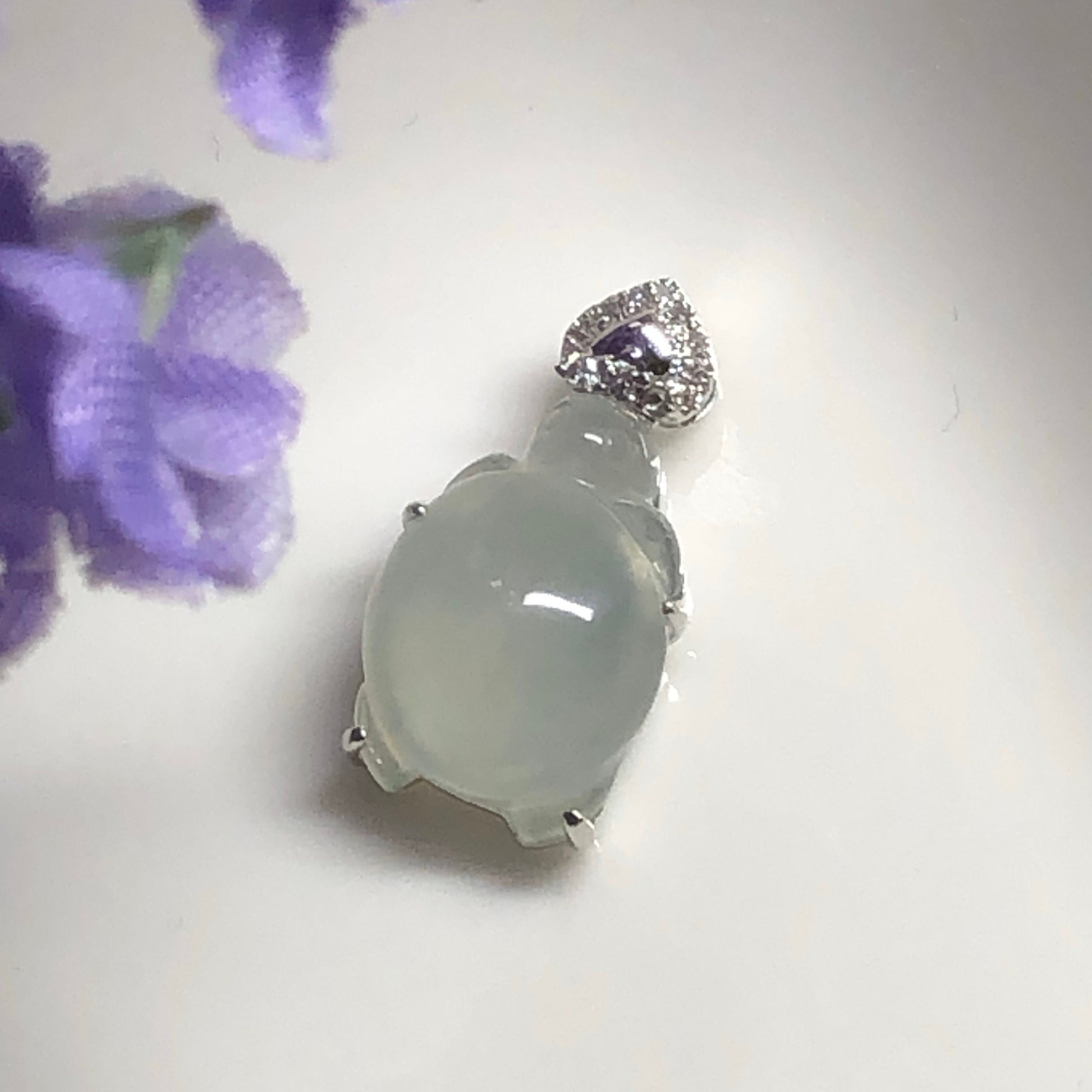NEW Grade A Icy Jadeite Jade Carved Turtle of Love Pendant set on 18K White Gold